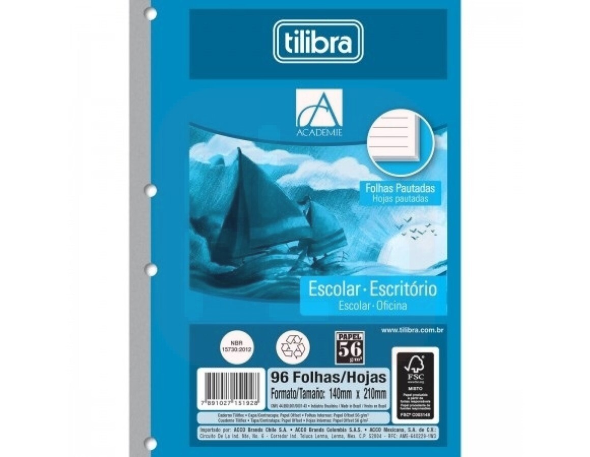 O Refil Tiliflex para Caderno Argolado 1/4 Académie possui folhas pautadas coladas.