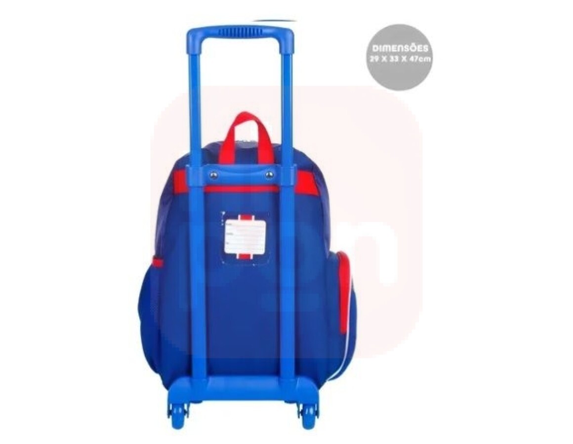 Perfeita para acompanhar a rotina escolar, a mochila conta com compartimento principal espaçoso, bolso frontal prático e bolsos laterais em redinha, ideais para garrafinhas ou pequenos objetos. O carrinho em metal, com duas rodinhas e pés de apoio, garante praticidade e segurança no transporte, além de aliviar o peso nos ombros.